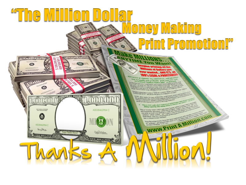 The One & Only ORIGINAL, and still ONLY way to legally and profitably print your very own CUSTOM “Thanks A Million” Marketing Dollar Bills on demand anytime YOU want!