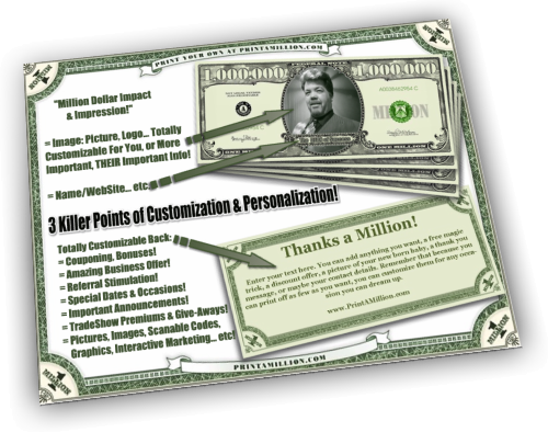 REALLY Want To Make a Million Dollar IMPACT With Your Business & Relationships? ~ How about sending THEM a few Million Dollar, but WITH THEIR Name, Logo, Picture and Marketing Information all over them! – – WOW, Now THAT Get’s You NOTICED as a Million Dollar Player! (Plus Hundreds More Proven, Profit-Producing Ideas That ROCK With RESULTS!)